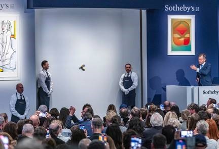 Những người tham dự lễ hội nghệ thuật này cố gắng tìm hiểu xem liệu một quả chuối màu vàng đã chín có những đốm đen được dán trên bức tường trắng bằng băng keo bạc loại dán thùng gửi hàng là một trò đùa hay là lời bình luận đầy thách thức láo xược về các tiêu chuẩn đáng ngờ trong giới sưu tập nghệ thuật.
